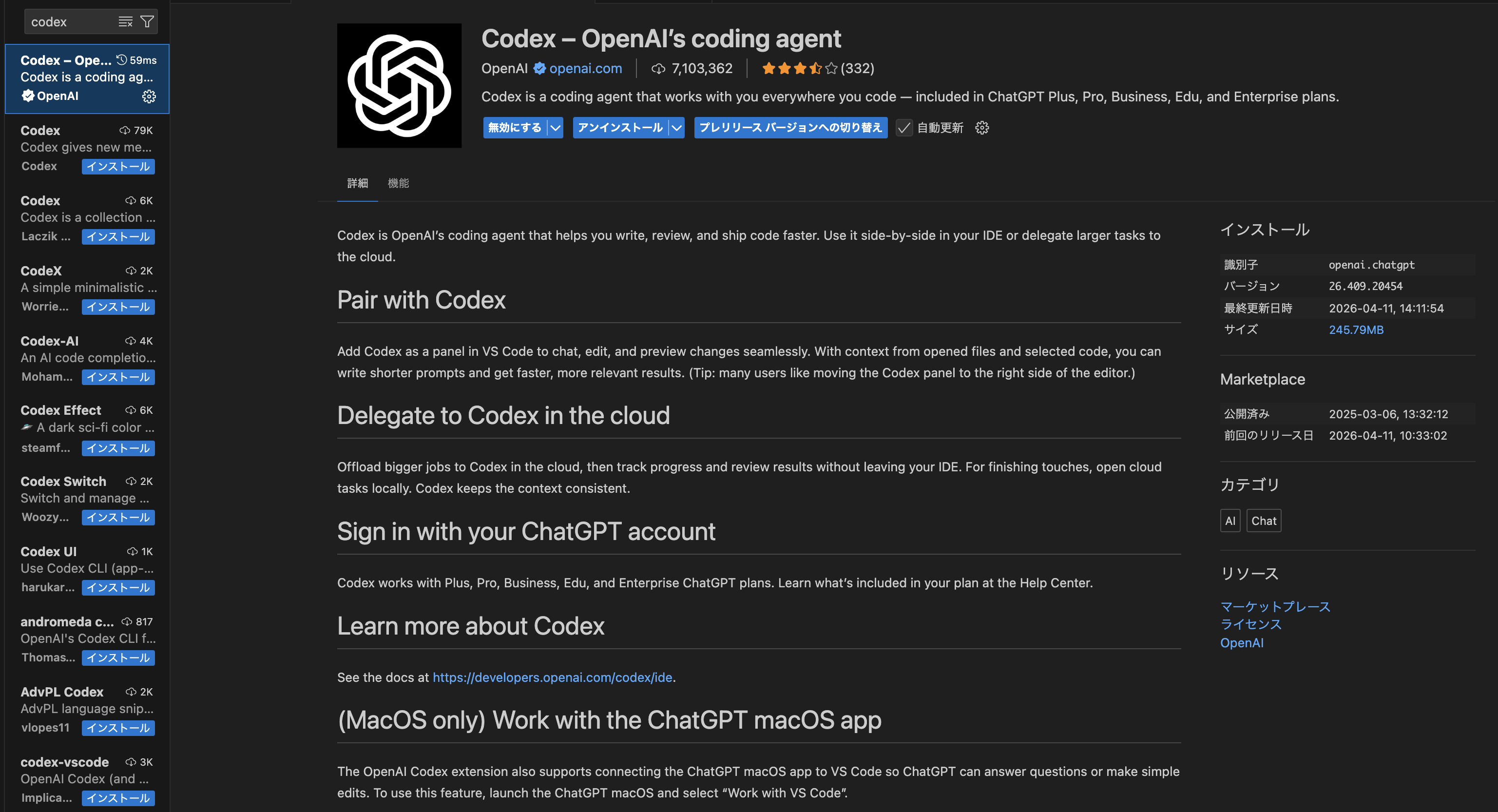 拡張機能の検索で「Codex」と入れ直してください。VS Codeを再起動すると表示されることがあります。